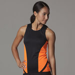 100% polyester with moisture management finish. Contrast side panels with flatlock stitching. Contrast ‘V’ inserts at lower hem. Straight front hem, curved back hem. Self fabric bound armholes. Gamegear® woven label. Size 8, 10, 12, 14, 16